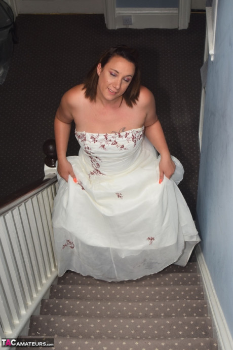 Amateur lady Sara Banks as her tits and cunt freed from a gown by two men