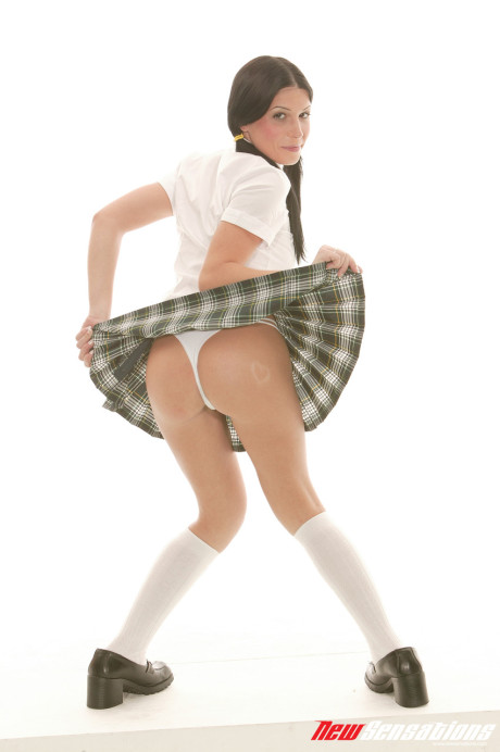 Brunette schoolgirl Rebeca Linares strips and licks a dong before anal sex