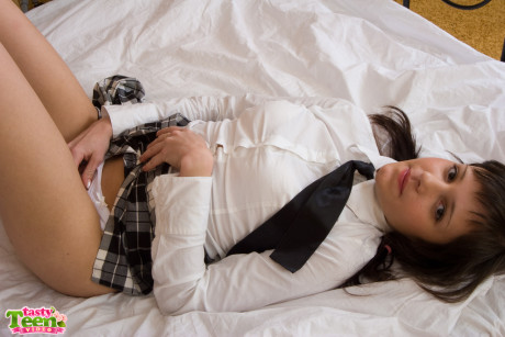 Brunette student has her butthole fingered before her first anal fuck on a bed