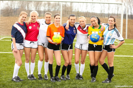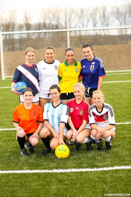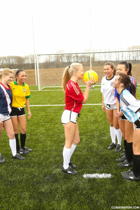 Naughty soccer babes strip each other and flaunt their melons on a soccer pitch