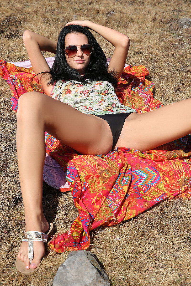 Dark haired young Sapphira frees her tight ass and cunt from thong panties