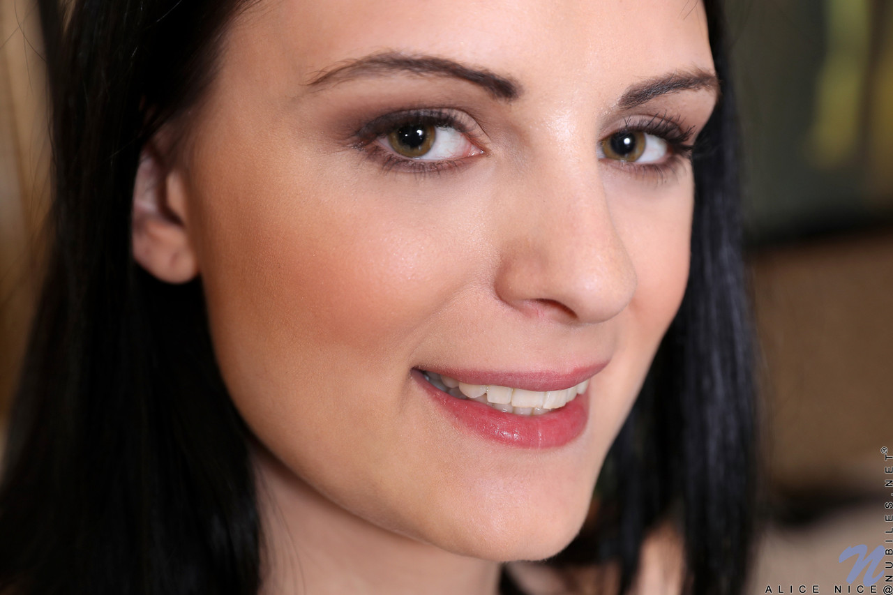Dark-haired babe Alice Nice shows her charming vagina & her natural titties up close