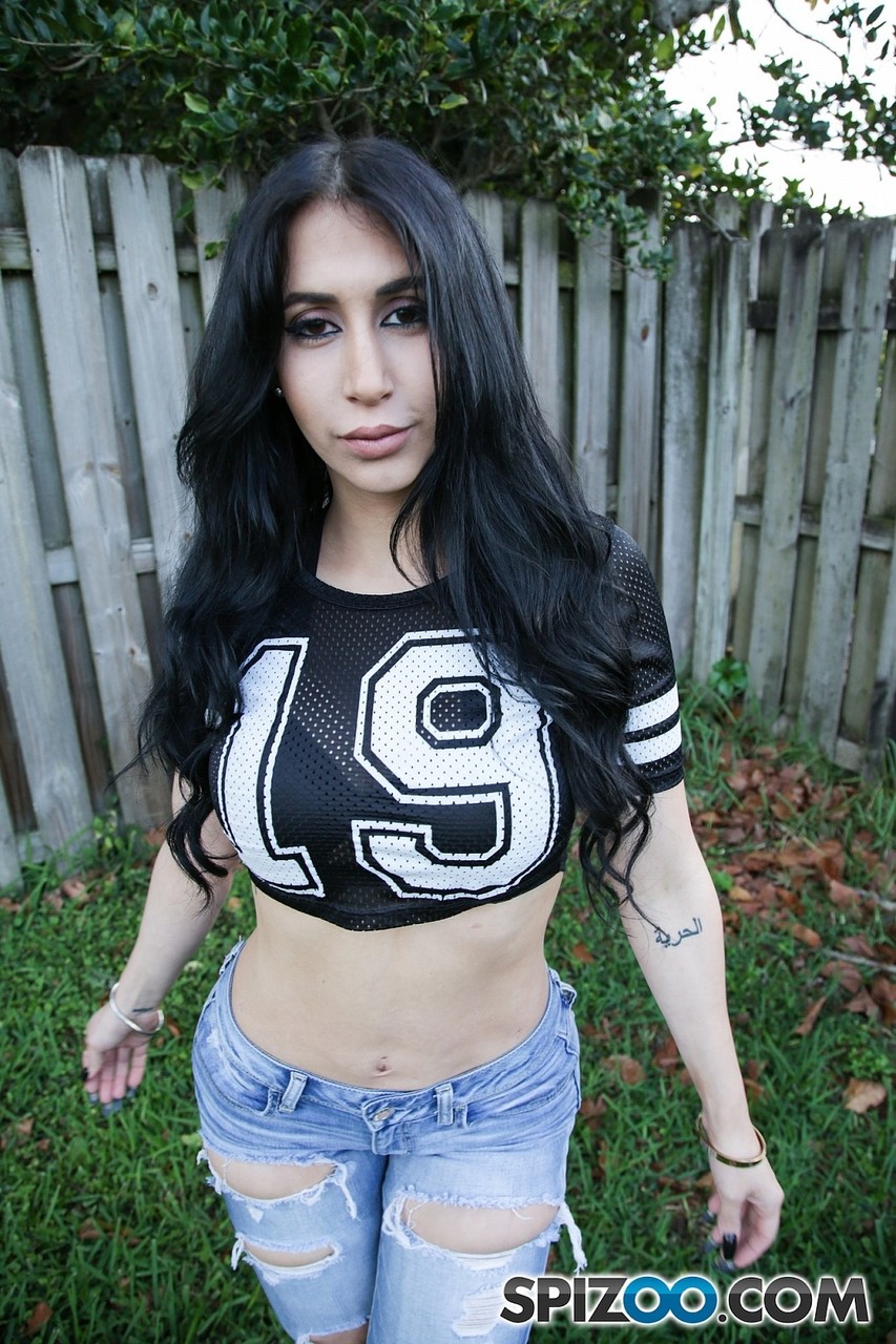 Ebony haired Cuban Valerie Kay exposes her humongous tits and well rounded behind