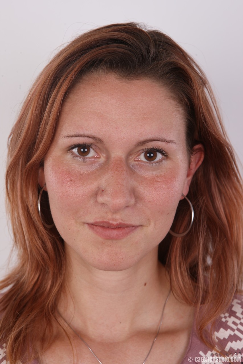 Ginger first timer holds her face firm while taking off all her clothes