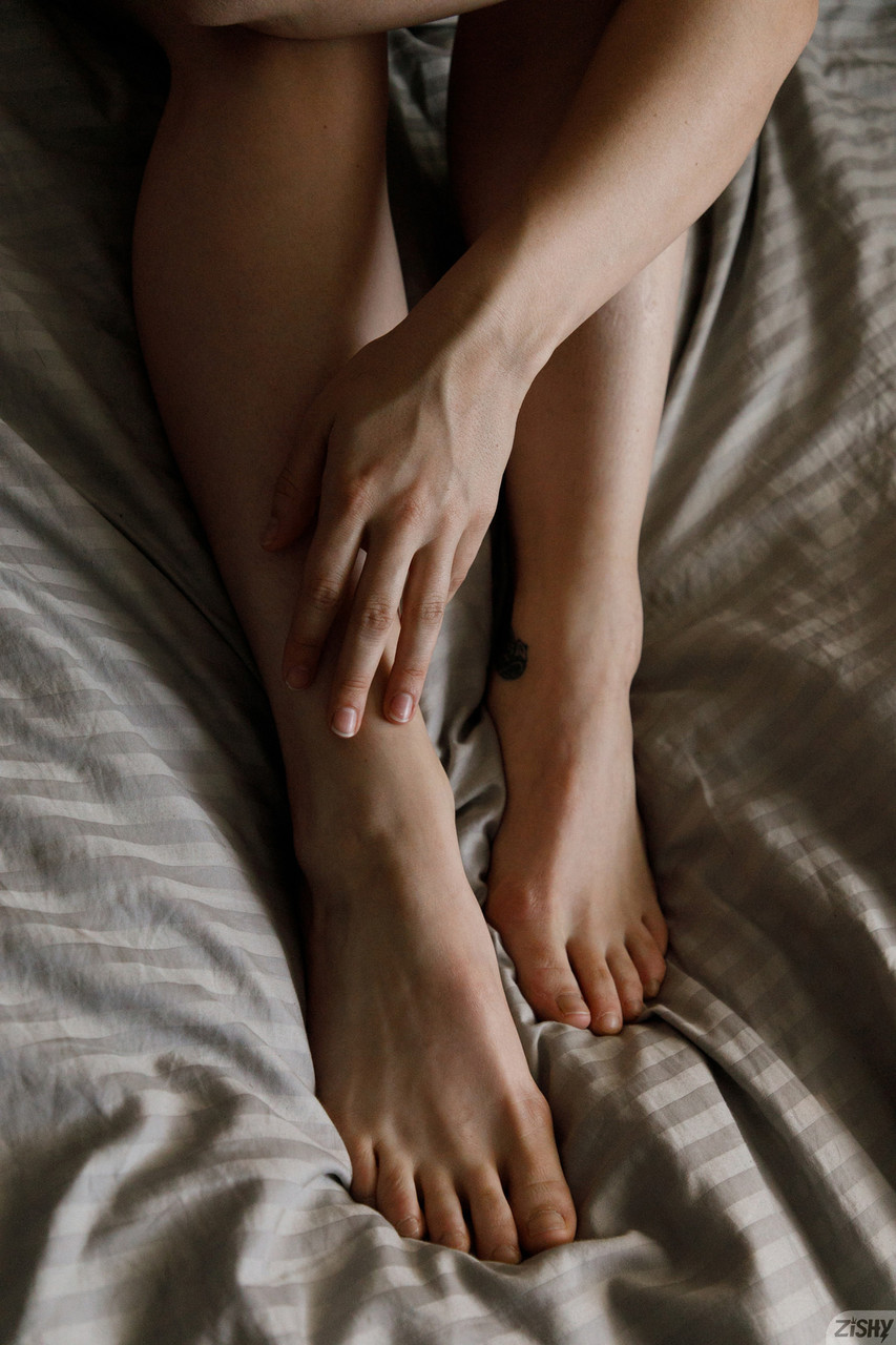 Sexy amateur Chaney Gunn shows off her small melons while naked on her bed