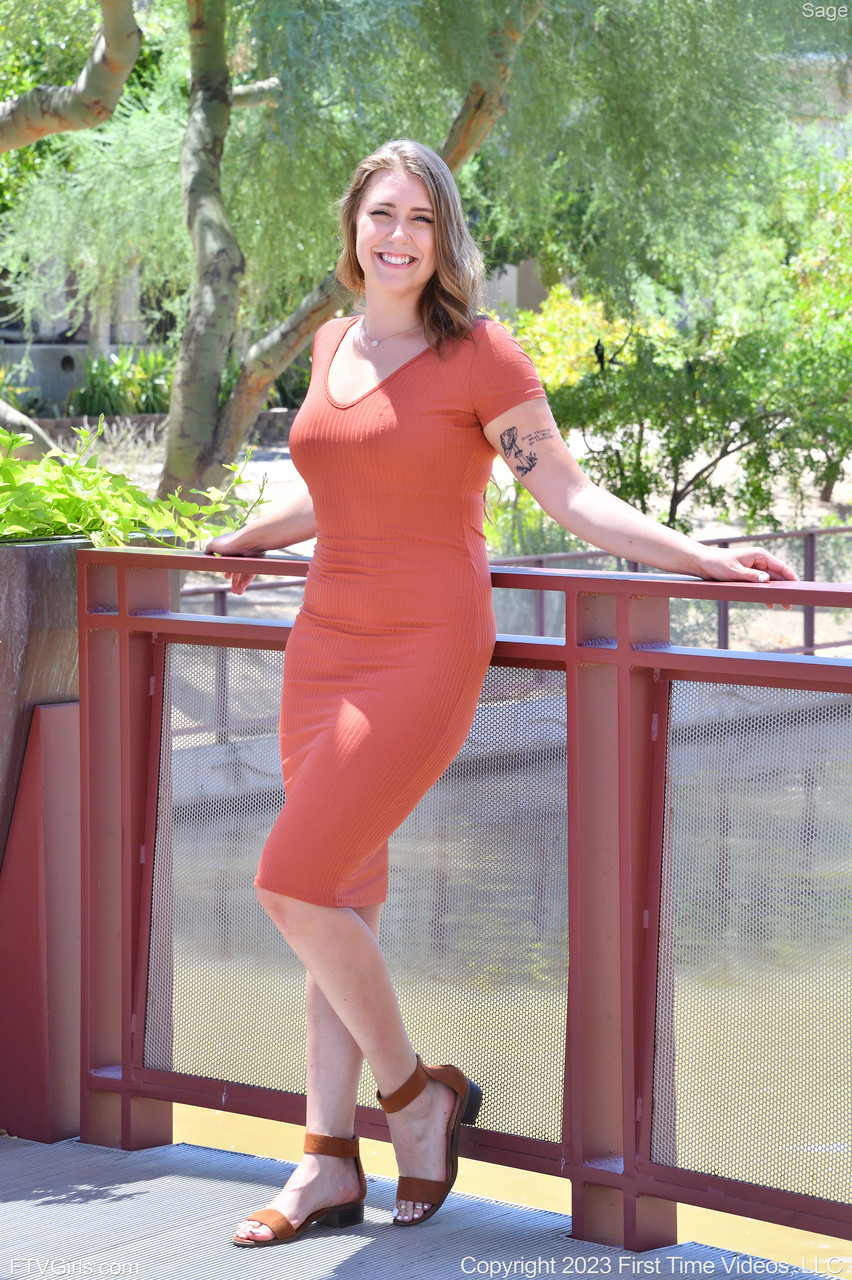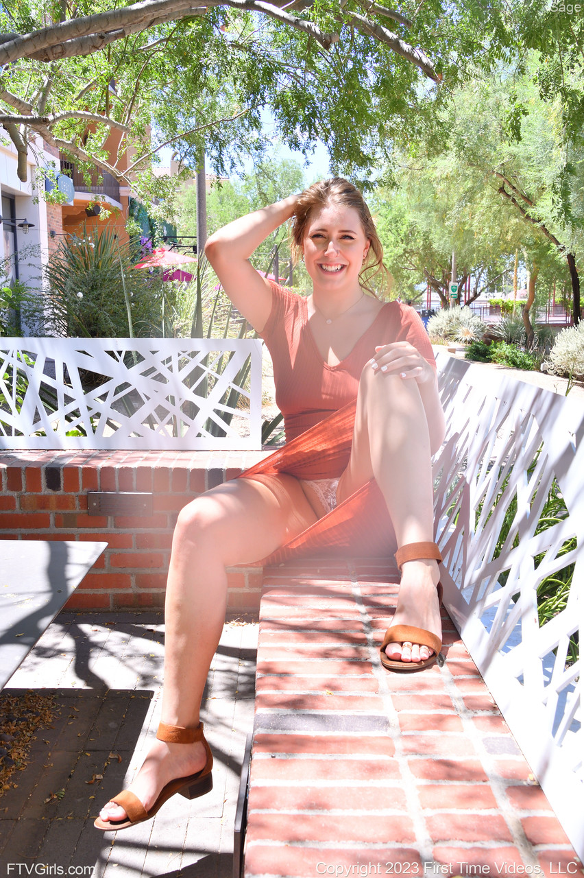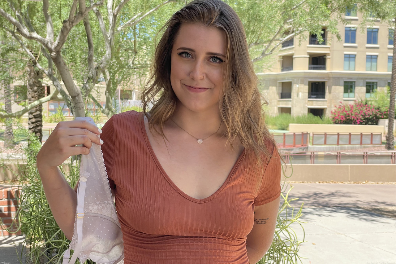 Glamorous brunette babe Sage flashing her panties and bra in public