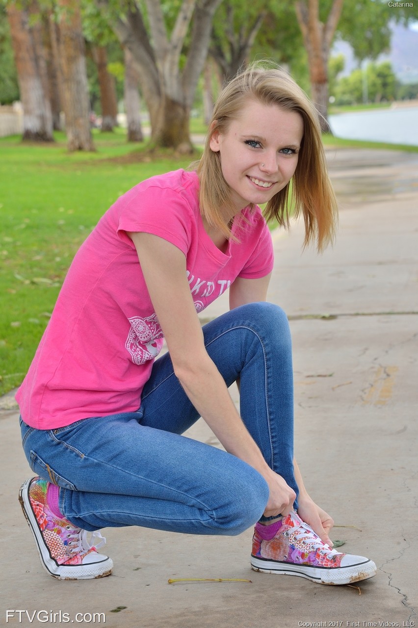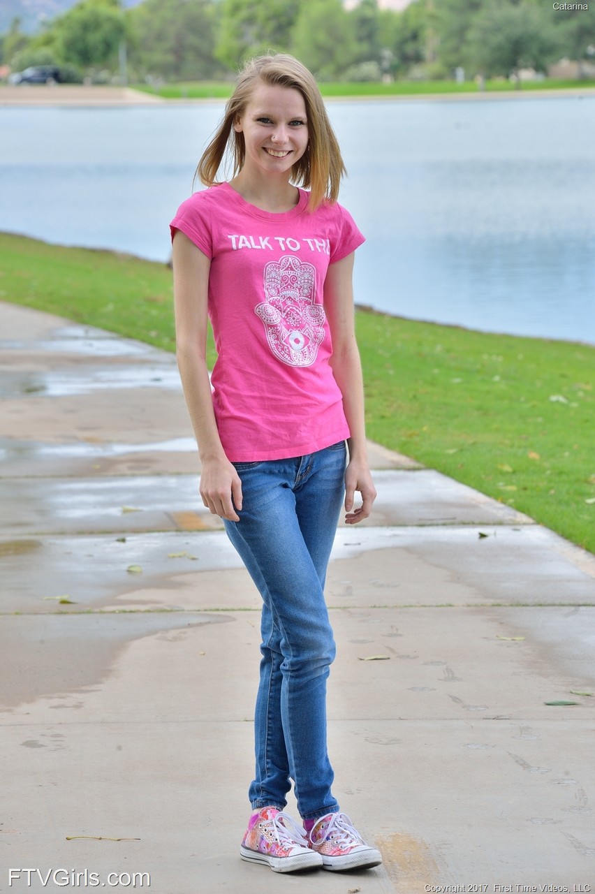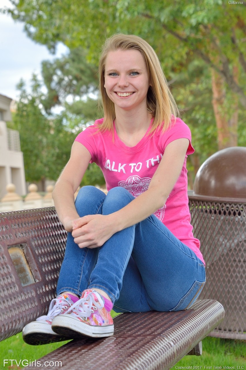 Cute petite young Catarina unveils her tiny boobies and lovely clam at the park