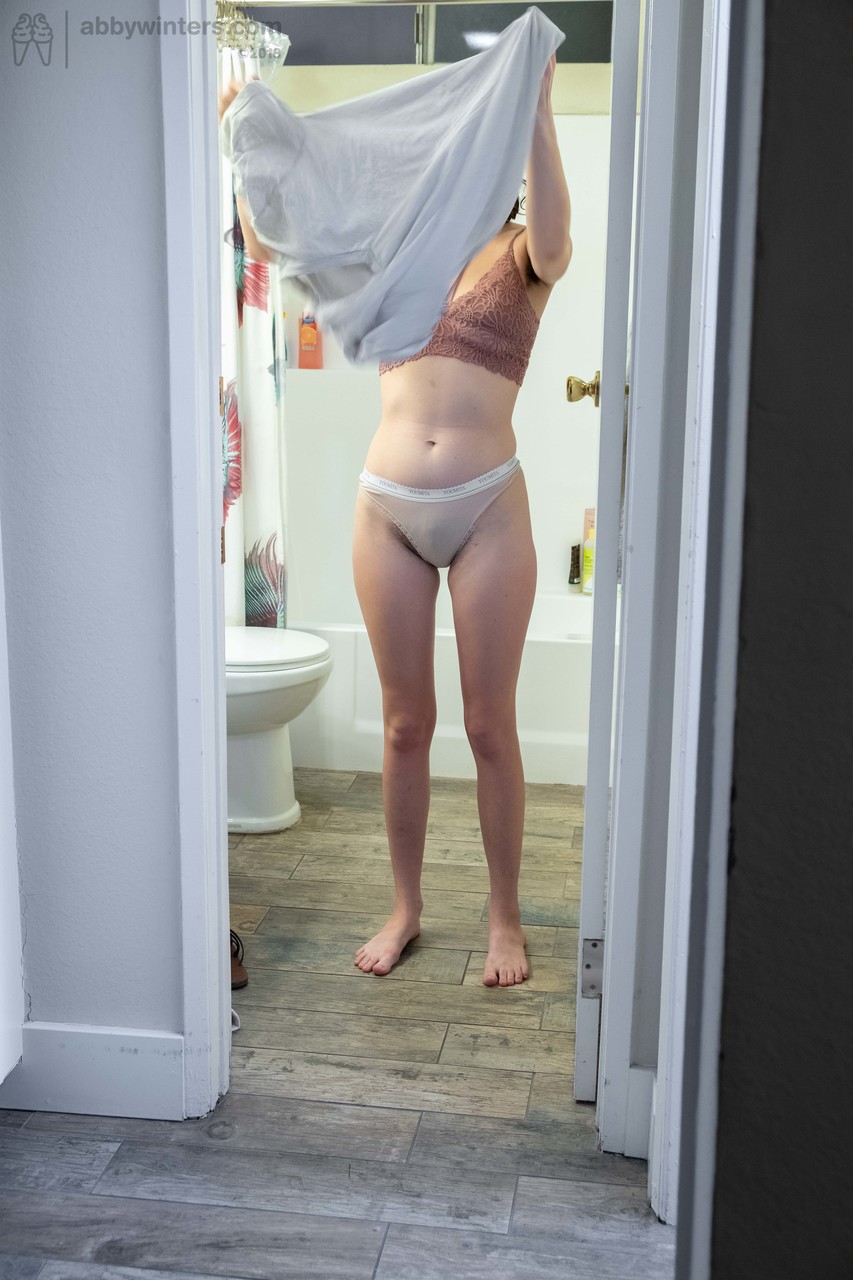 Nude brunette with natural bush Mary J caught getting dressed in the bathroom