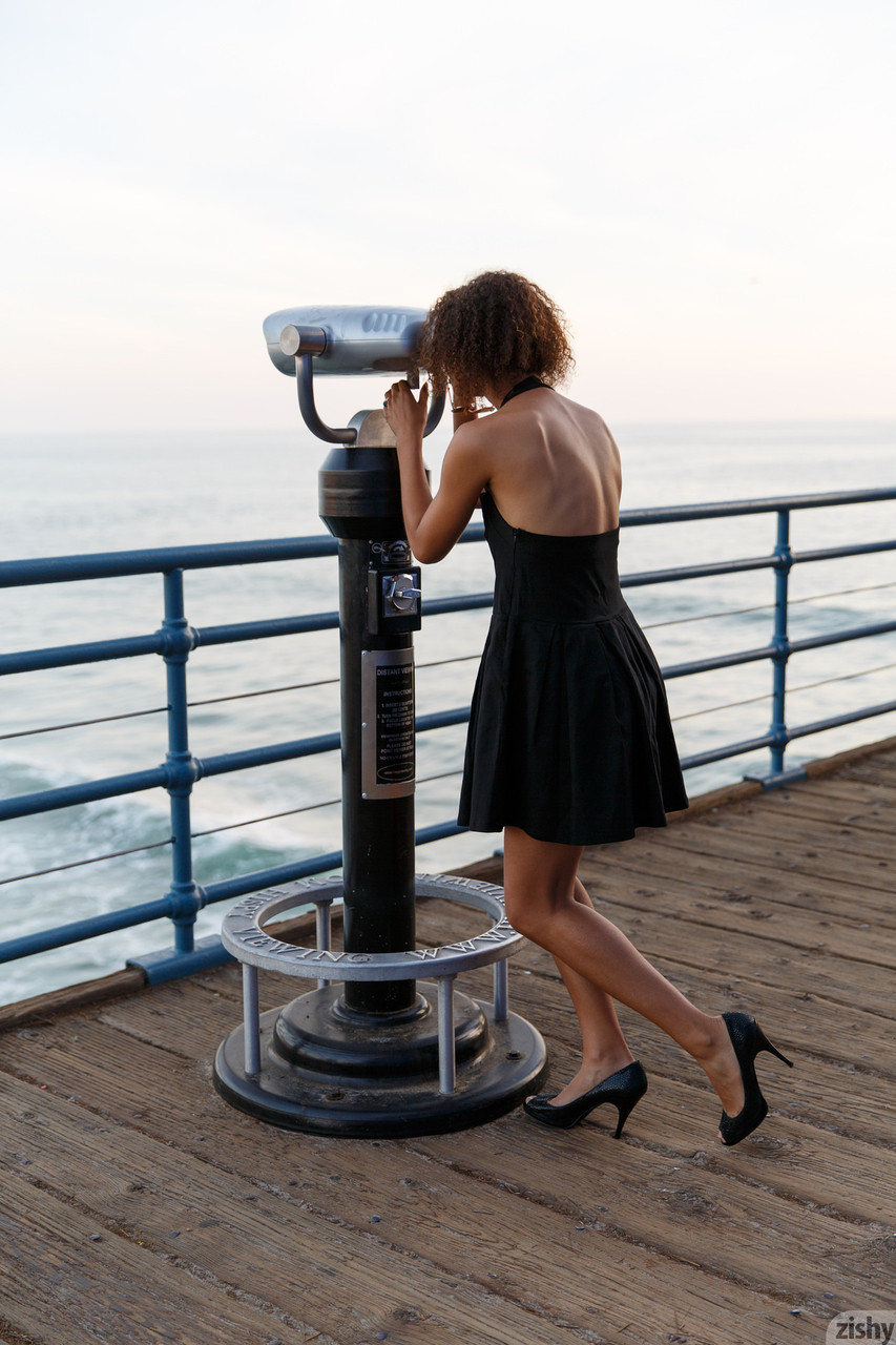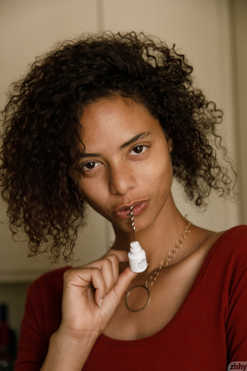 Skinny black Desiree Jacobsen shows her tiny boobs & bubble ass in a solo