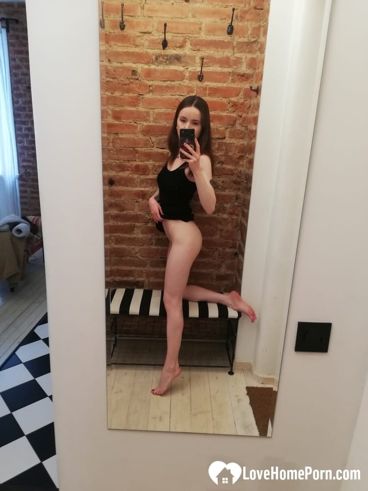 Short brunette takes selfies while stripping & posing sexily in the mirror