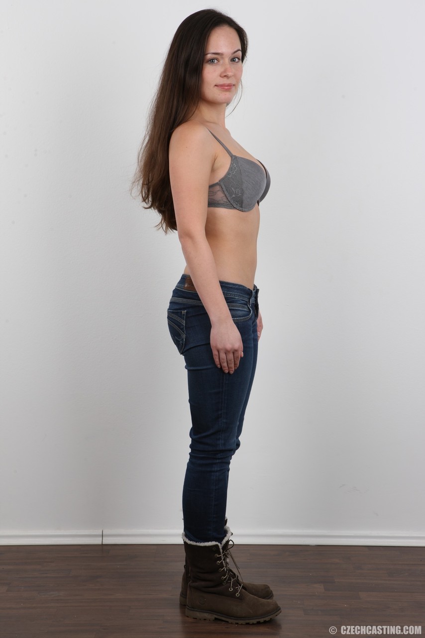 Gorgeous brunette in jeans peels slowly for this photo striptease series