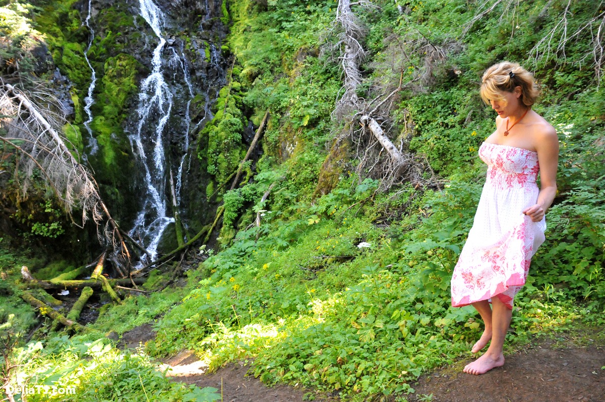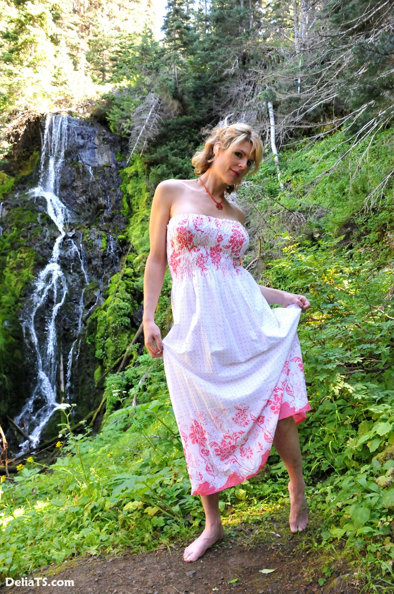Stunning pretty Delia by waterfall erect under her dress