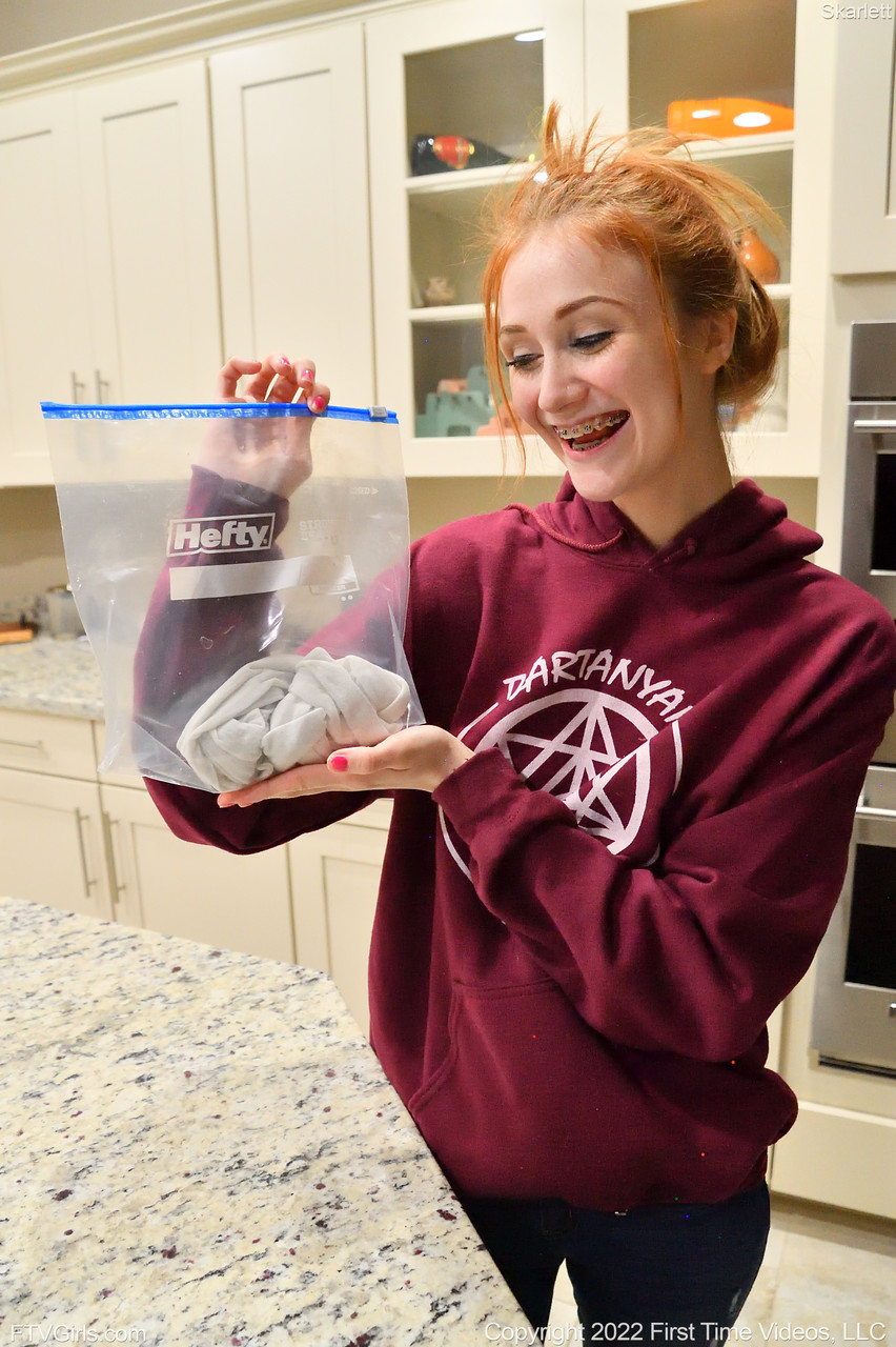 Redheaded beauty Skarlett toys her bald snatch and poses undressed outdoors