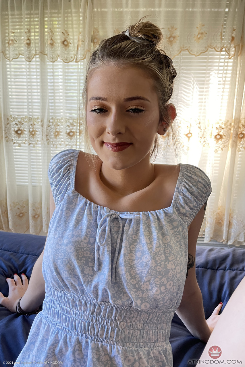 Gorgeous lovely babe Meloni Moon spreads her inviting shaved snatch on her bed