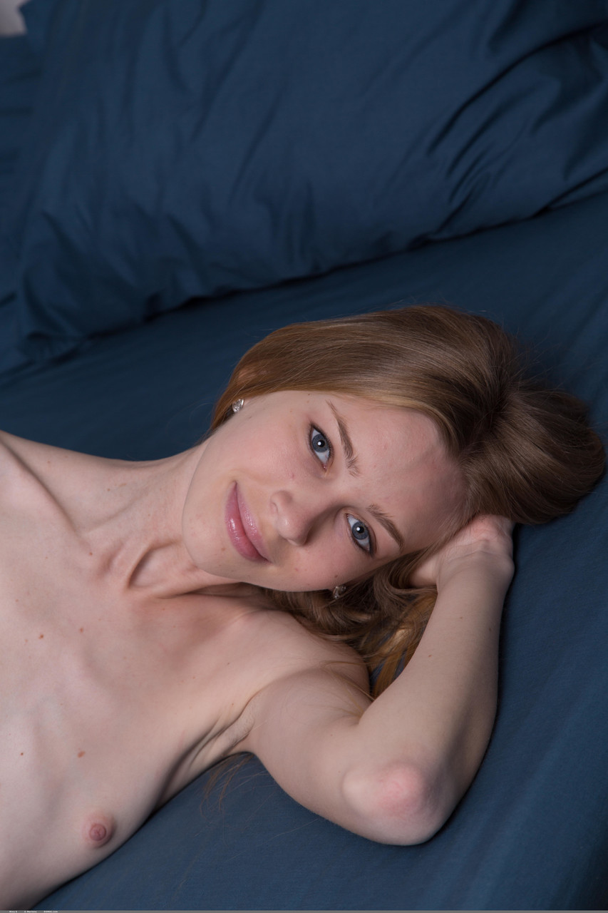 Fabulous young Rina E exposing her extremely petite body naked on her bed