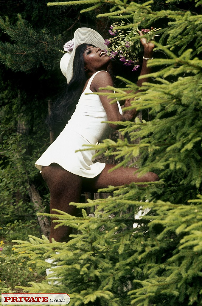 Black female in sunhat and bikini heads into the bushes to pose nude