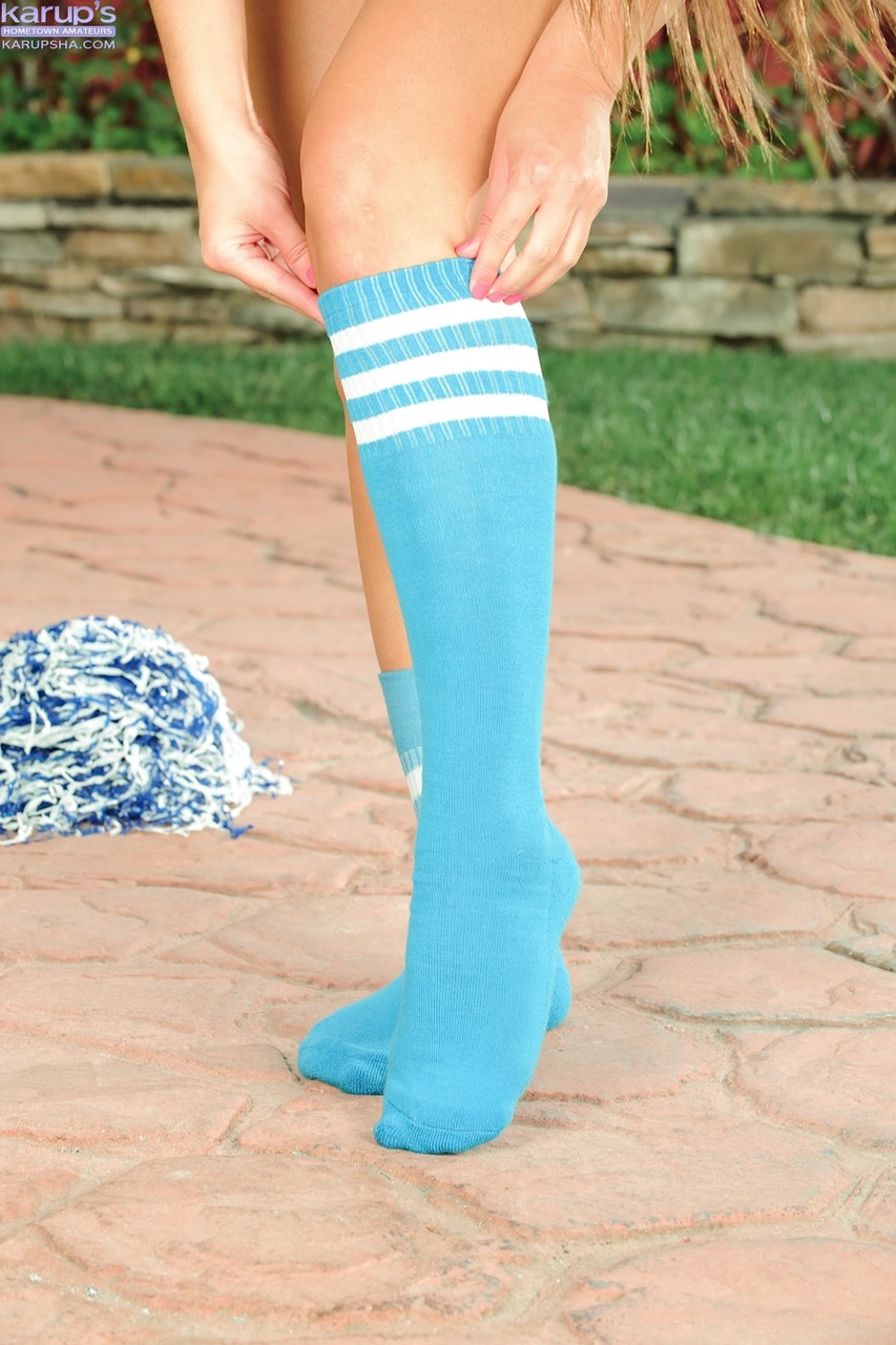 Kinky cheerleader Abby Rocks shows off her shaved twat & her big butt
