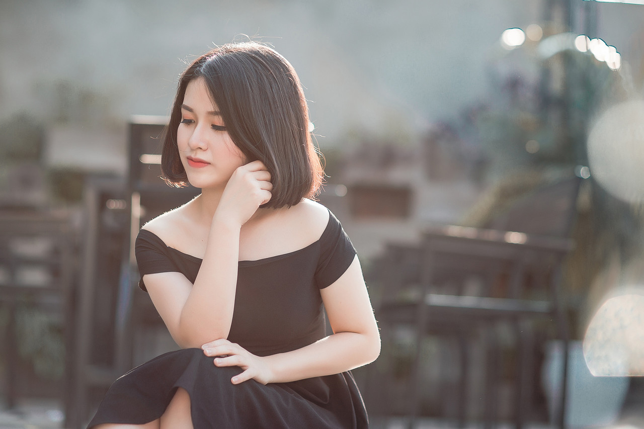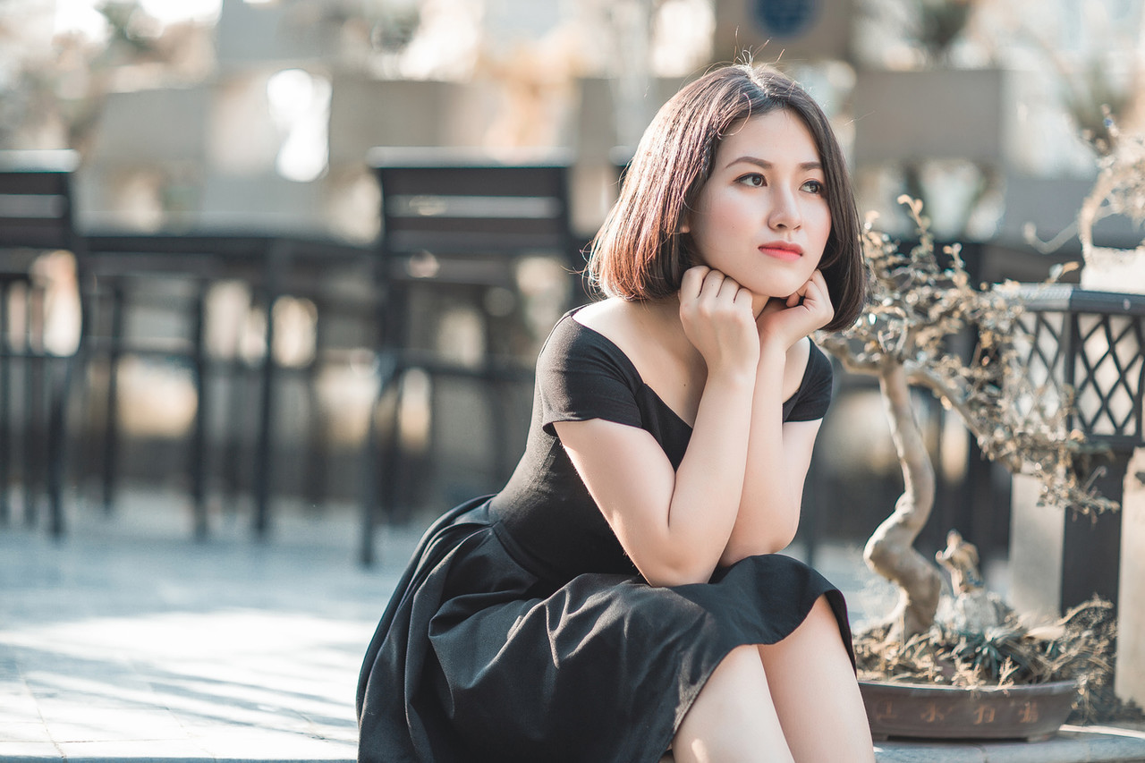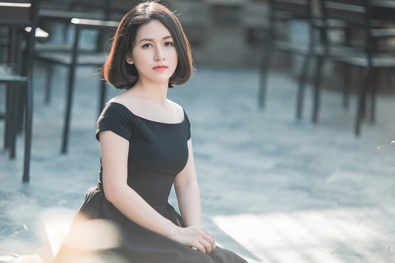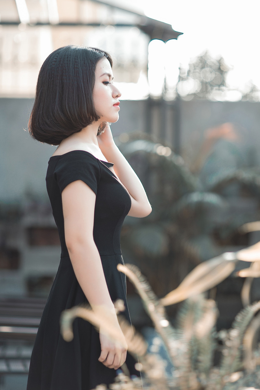 Glamorous chinese babe posing in her elegant ebony dress in public