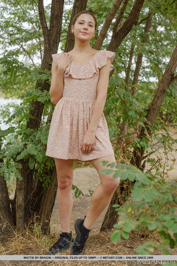 Petite young Mattie strips totally nude in front of a tree while outdoors
