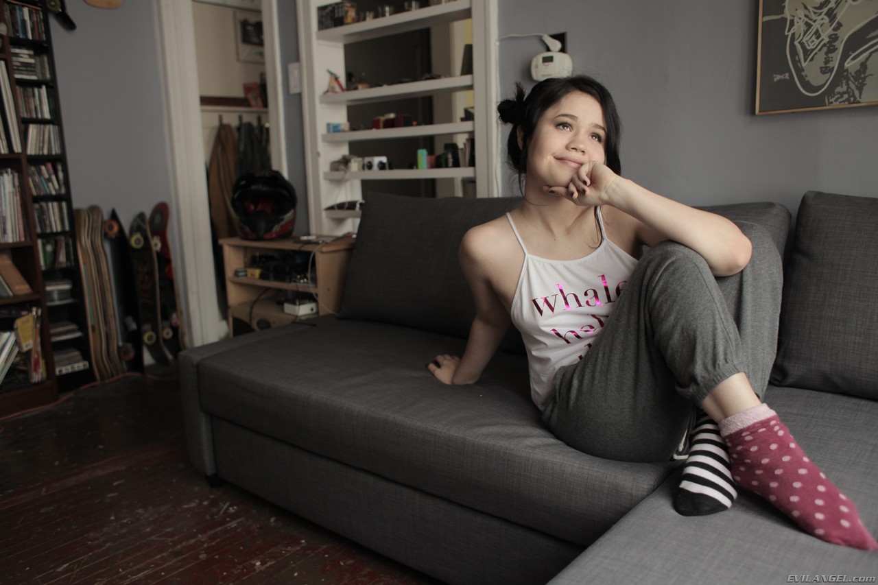 Dark haired young Yhivi exposing bushy twat and anus in socks