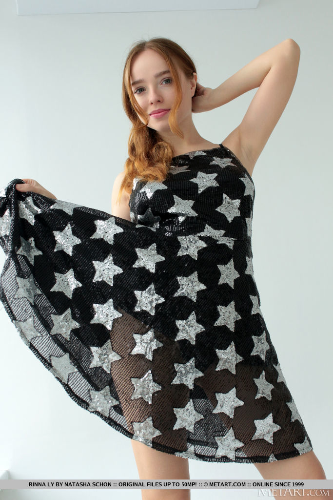 Attractive redheaded young Rinna Ly unveils her great melons while getting naked