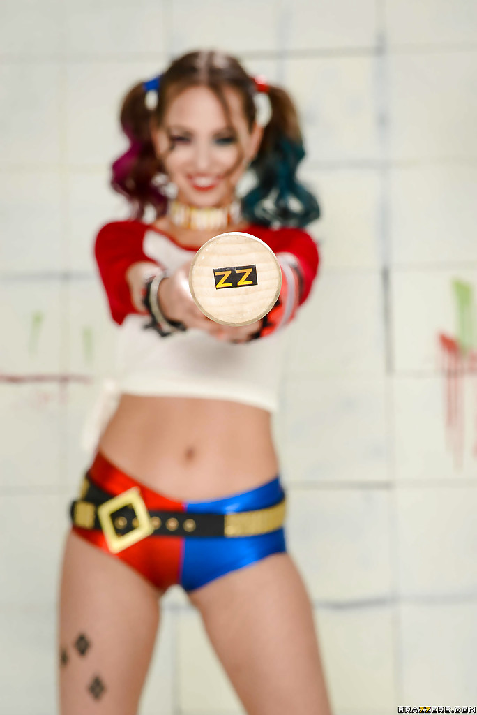 Cosplay attired model Riley Reid exposing tiny boobies in pigtails and heels