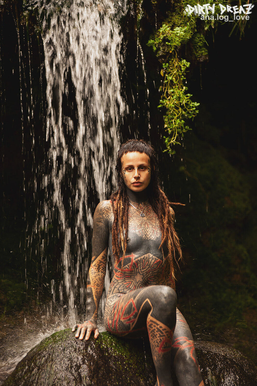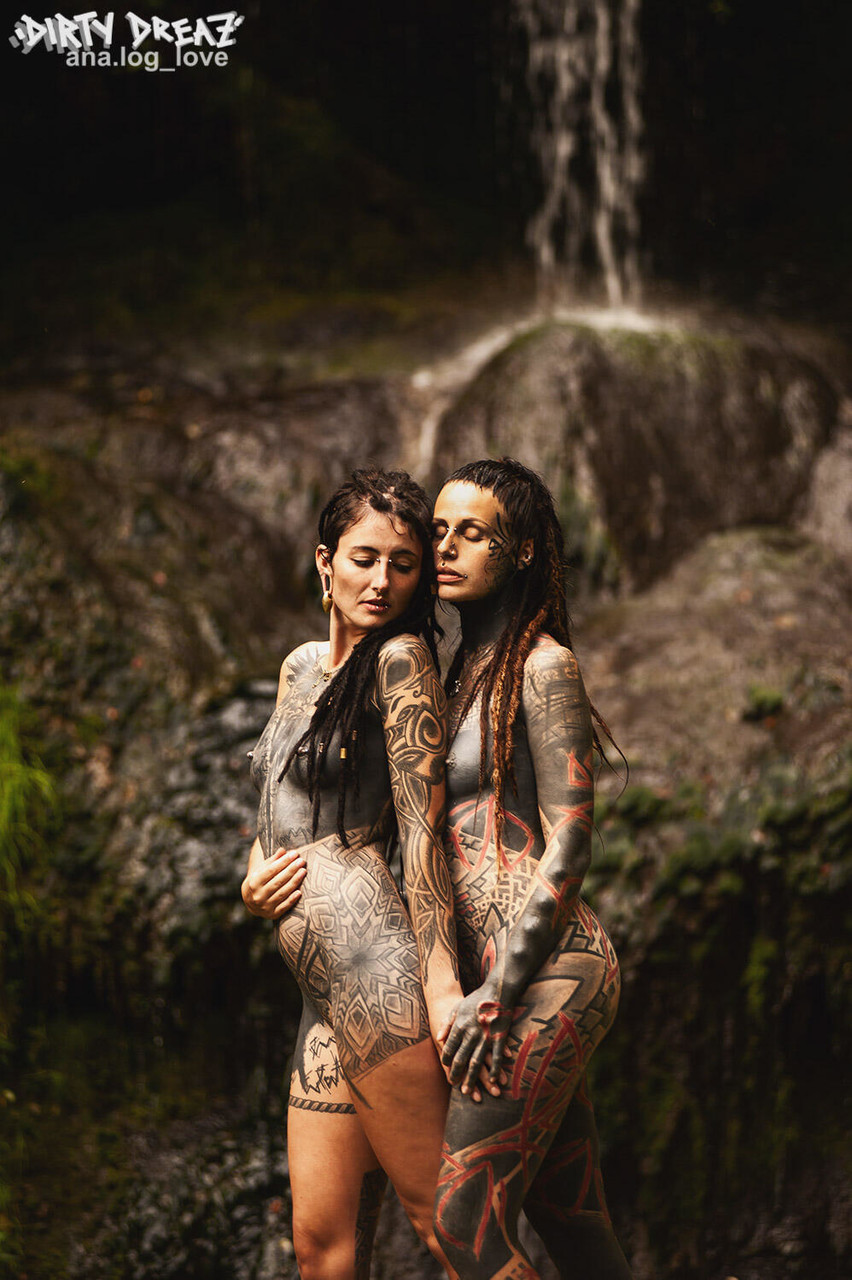 Heavily tattooed lesbians hold each other while totally nude on a bridge